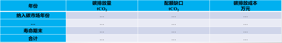 3)項目計算期內(nèi)各年度的碳排放費用、總排放費用:見下表。
