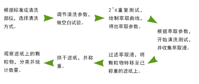 使用某種或多種機(jī)械方法,通過清洗液在規(guī)定的時間內(nèi),把污染物從樣品上分離到清洗液中,最終把萃取液過濾到測試濾膜上,分析濾膜上的顆粒重量、數(shù)量、性質(zhì)等。
